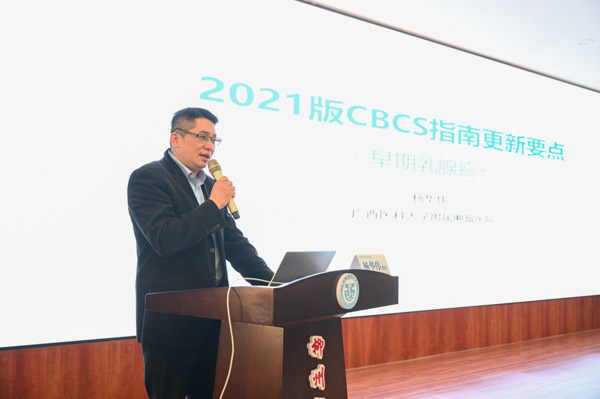此次學術會議精彩紛呈,并首次采用線上線下齊頭并進的方式進行授課及討論。中山大學孫逸仙紀念醫院李國照、龔暢、曾韻潔、汪穎等專家分別在線上就乳腺癌新輔助化療影像判讀及其問題、HPK治療新模式、乳腺癌病理分子標志物檢測新進展及HER2陽性晚期乳腺癌治療新進展進行了精彩的授課。廣西醫科大學附屬腫瘤醫院專家莫欽國、楊華偉、汪多平在現場向學員們講授了乳腺癌防治的一體化對診療效果的提升、經腋無充氣腔鏡甲狀腺手術的應用及2021版CBCS熱點更新解讀。廣西醫科大學第一附屬醫院曾健對新治療模式下乳腺癌外科策略等熱點問題進行了精彩授課。