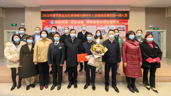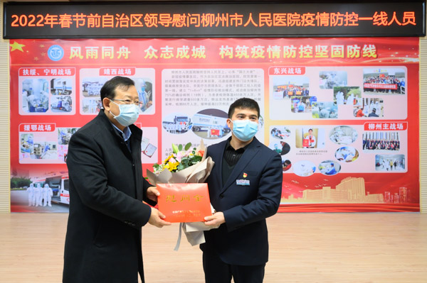 1月12日上午,自治區人民政府副主席李彬、副秘書長李盛一行,在市人民政府副市長盧柳屏等領導陪同下,到柳州市人民醫院慰問疫情防控一線工作人員,并召開座談會。市衛生健康委黨組書記、主任林衛,市人民醫院黨委書記劉兵,以及12名疫情防控一線人員代表參加會議。