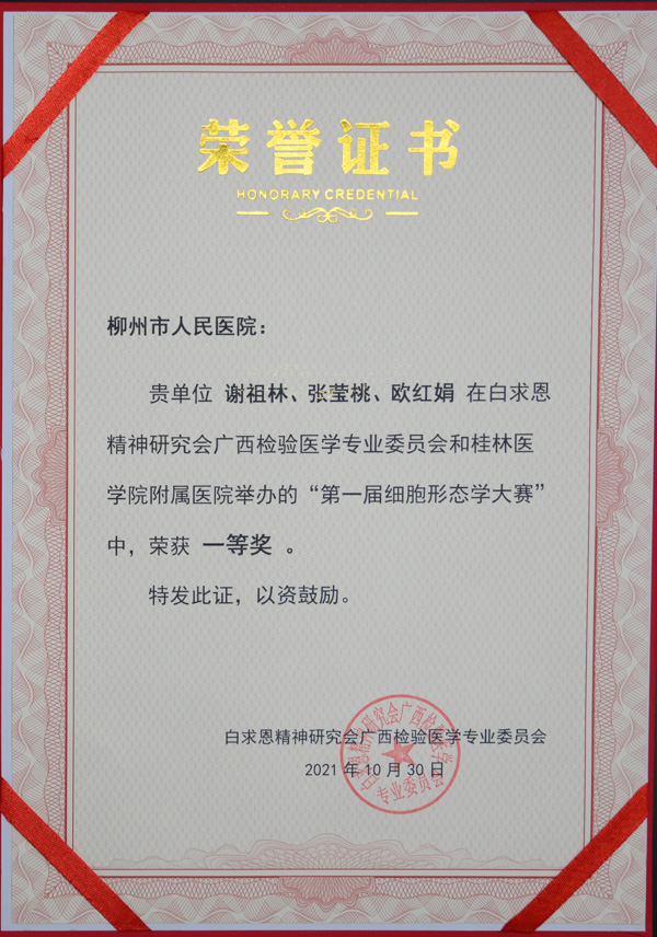 近年來(lái)陸續(xù)在廣西寄生蟲(chóng)防治技術(shù)競(jìng)賽獲得團(tuán)體二等獎(jiǎng)、血液病診斷論壇形態(tài)學(xué)大賽中獲二等獎(jiǎng)、白求恩精神研究會(huì)廣西檢驗(yàn)醫(yī)學(xué)專業(yè)委員會(huì)第一屆細(xì)胞形態(tài)學(xué)大賽團(tuán)體一等獎(jiǎng)。