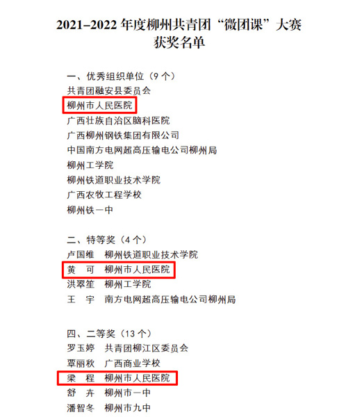 日前,由共青團柳州市委主辦、柳州市團校承辦的“喜迎二十大、永遠跟黨走、奮進新征程”——2021-2022年度柳州共青團“微團課”大賽落下帷幕。柳州市人民醫院在比賽中獲評優秀組織單位,代表醫院參賽的黃可、梁程分獲特等獎和二等獎。