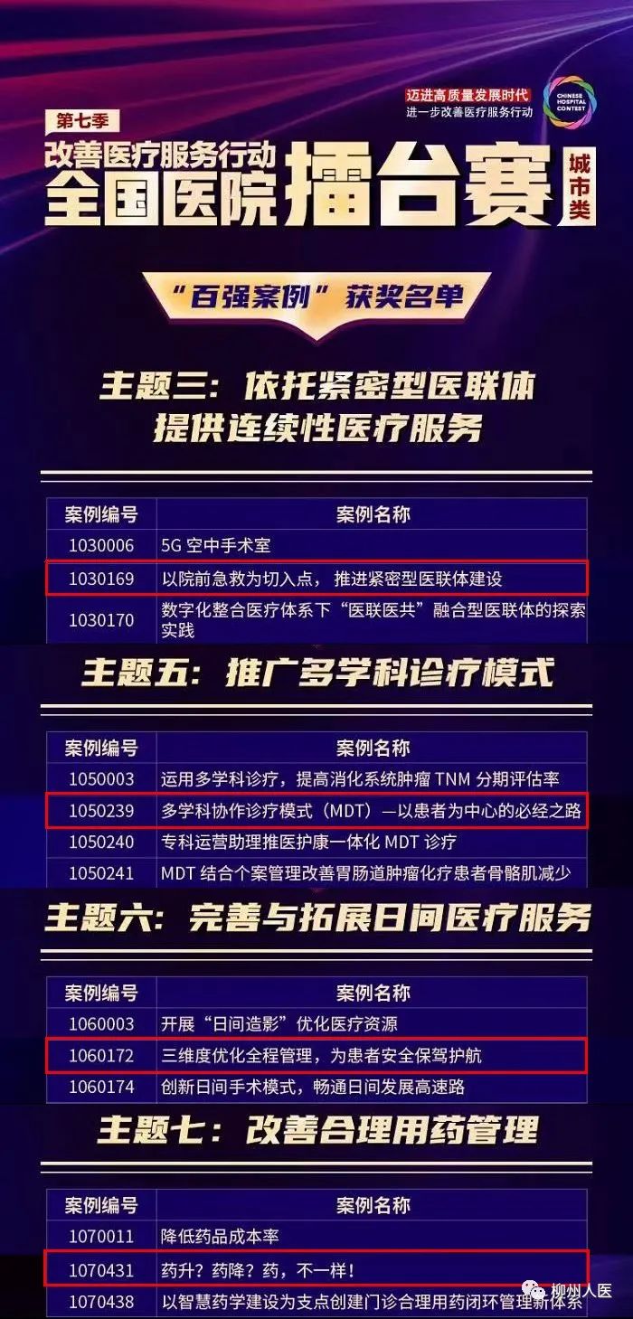 日前,由國家衛(wèi)生健康委醫(yī)政醫(yī)管局指導(dǎo)、健康界主辦的第七季改善醫(yī)療服務(wù)行動全國醫(yī)院擂臺賽(城市類)陸續(xù)揭榜,柳州市人民醫(yī)院喜獲佳績,共4個案例上榜“百強案例”名單,上榜數(shù)量為柳州市醫(yī)院最多!