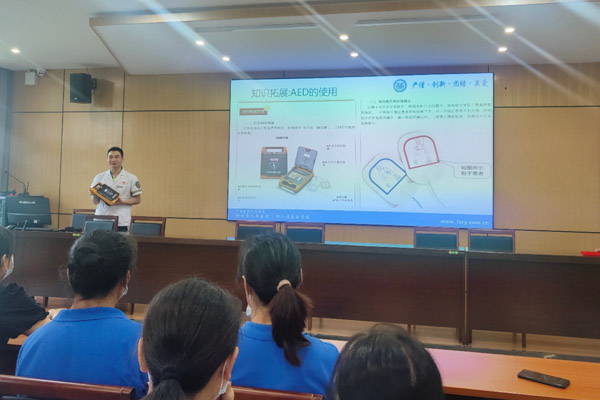 培訓現場,醫護人員以PPT結合實操的方式給大家展示心肺復蘇+電除顫(CPR-D)急救技術。就如何進行CPR-D急救相關知識進行詳細講解,使大家了對急救又有了更深層次的了解。
