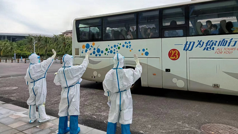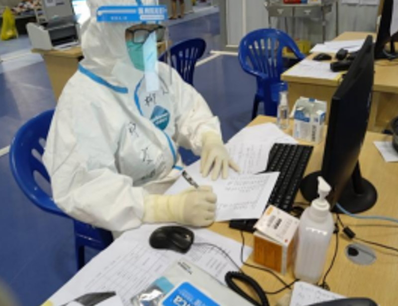 到達海南,我們進駐到了方艙醫院,14晚臨時接到通知要接收大量患者,隨著大巴車一輛輛的到來,那一刻我心中有些許不安,但看到人們信任的目光,便打起精神,迅速將人群分隔開避免聚集,并快速詢問病史、判斷病情,與其他隊員默契配合,快速為患者辦理入院手續。有一位小姑娘得知我們來自柳州,便笑著問這里有沒有螺螄粉吃,我告訴他這里暫時是沒有的,等疫情結束歡迎你來柳州吃正宗的螺螄粉!