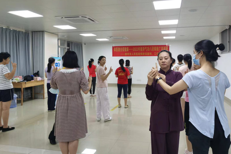 為進一步促進職工健康,近日,由柳州市人民醫院預防保健科、工會聯合柳州市體育局、柳州市武術協會舉辦的健身氣功八段錦推廣培訓班在柳州市人民醫院正式開班,培訓班特別邀請到柳州市武術協會技術部部長、國家級健身氣功、太極拳社會體育指導員、柳州武協十佳優秀教練員韋永紅老師來為大家授課。
