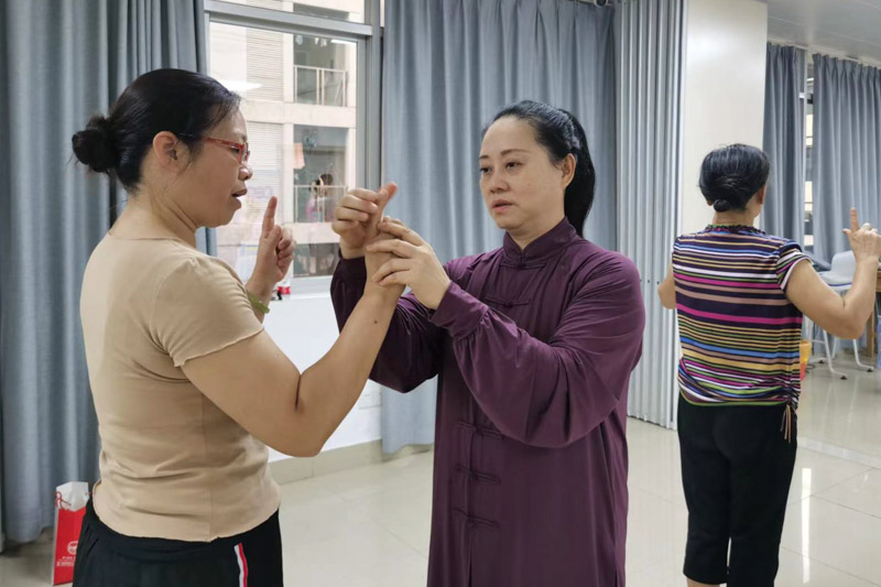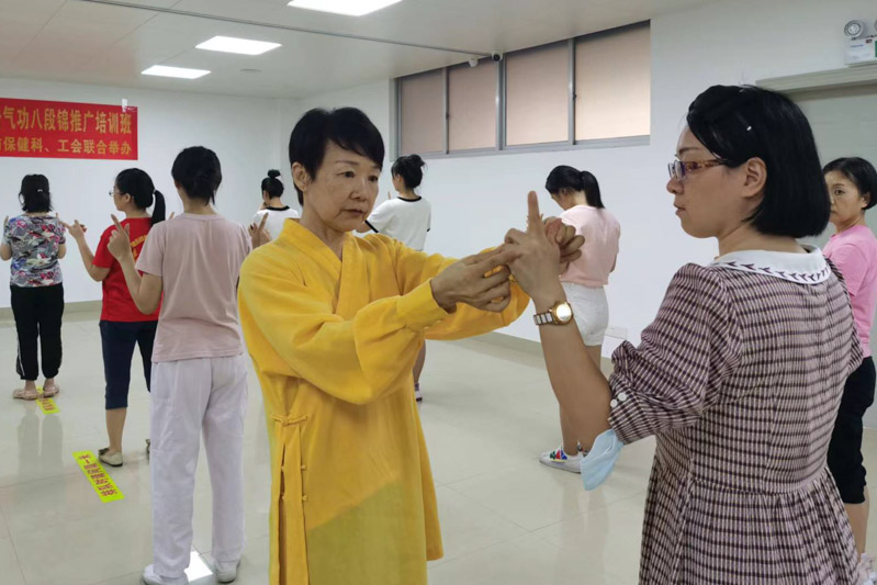 韋老師從八段錦的手型、步型、身型等基本功教起,不僅教授動作,而且用形象的比喻深入淺出地給學員講授了八段錦的養生功法,張助教則耐心地對學員的不合格動作進行一一糾正……一小時課程下來,老師和學員們都微微冒汗,覺得身心舒暢。