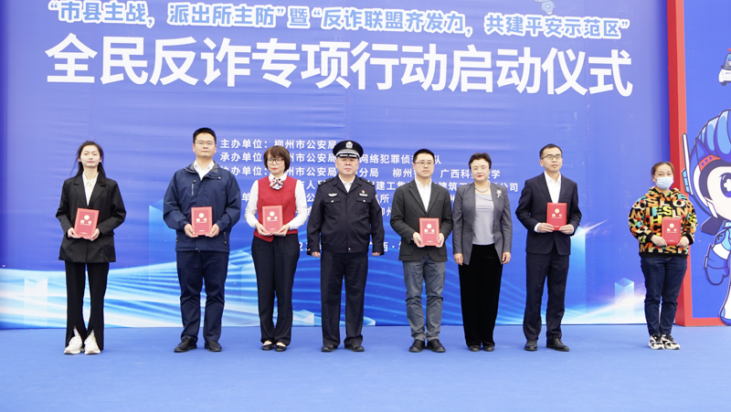 據悉,柳州市“反詐聯盟齊發力,共建平安示范區”全民反詐專項行動致力于營造全社會防范和打擊電信網絡新型違法犯罪的良好氛圍,實現電信詐騙發案、群眾損失明顯下降目標,最大限度保護人民群眾的財產安全和合法權益。儀式上,柳州市委政法委副書記林華、柳州市公安局常務副局長仲軍為柳州市人民醫院等多家單位授予柳州市“反詐聯盟齊發力,共建平安示范區”全民反詐專項行動共建單位牌匾,并為共建單位反詐宣傳員代表頒發聘書。