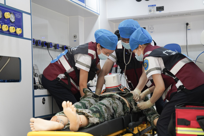 接到比賽通知時,距離比賽時間僅有5天時間,時間緊、任務重!隊員們在每日繁忙的工作之余,大家爭分奪秒進行訓練!嚴重多發傷、胸痛、卒中、急性消化道出血……各種急救處置措施、所有急救方案的緊密協調配合,在模擬訓練中大家精益求精、力求更快、更好救治每一位危重患者!