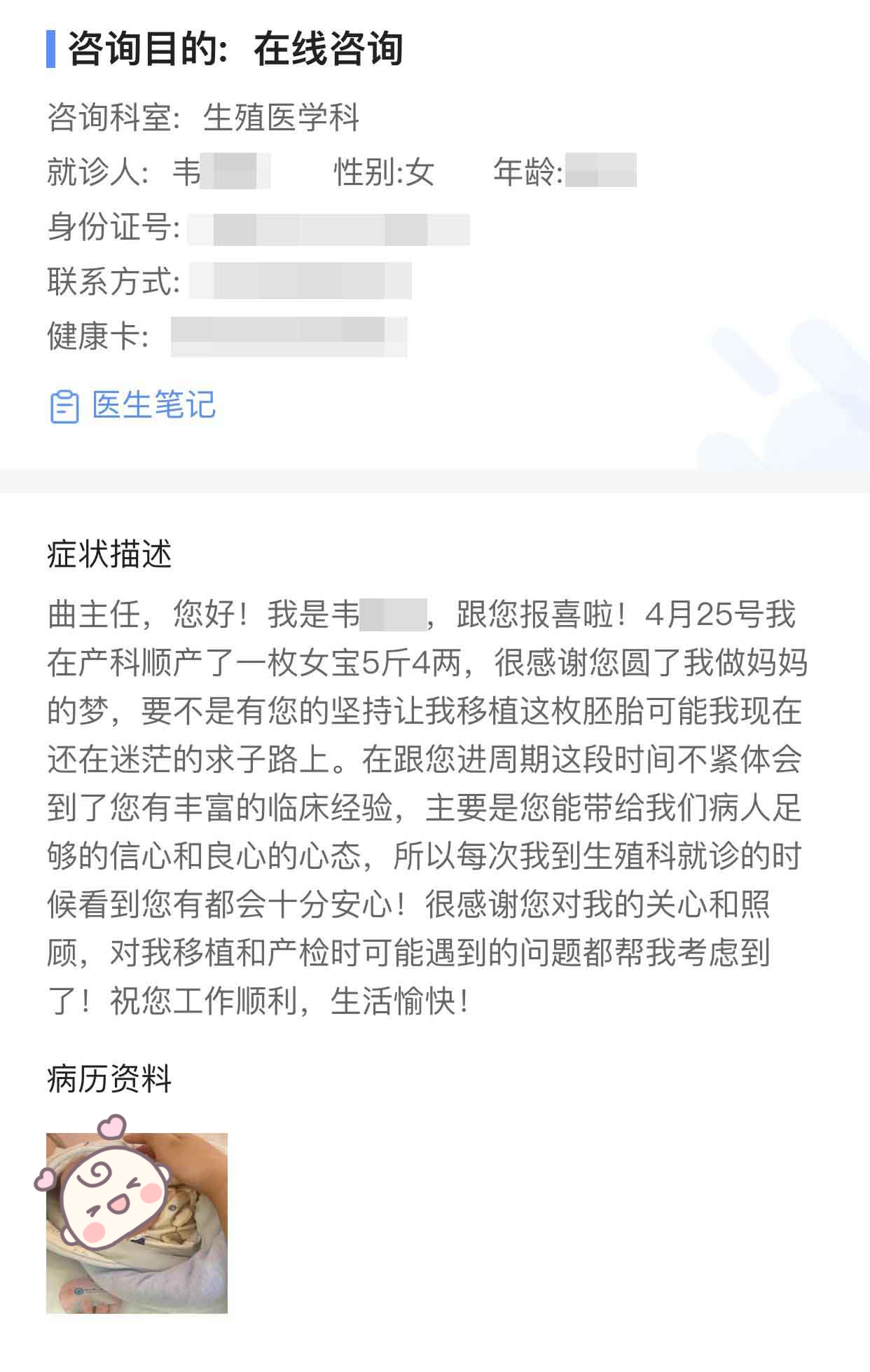“曲主任,我來向您報喜了!寶寶5斤4兩,感謝您圓了我做媽媽的夢!”日前,生殖醫(yī)學科收到了一份特殊的“在線咨詢”。心懷感激的韋女士,通過柳州市人民醫(yī)院服務號的線上咨詢服務,向生殖醫(yī)學科傳達了自己圓夢的好消息。