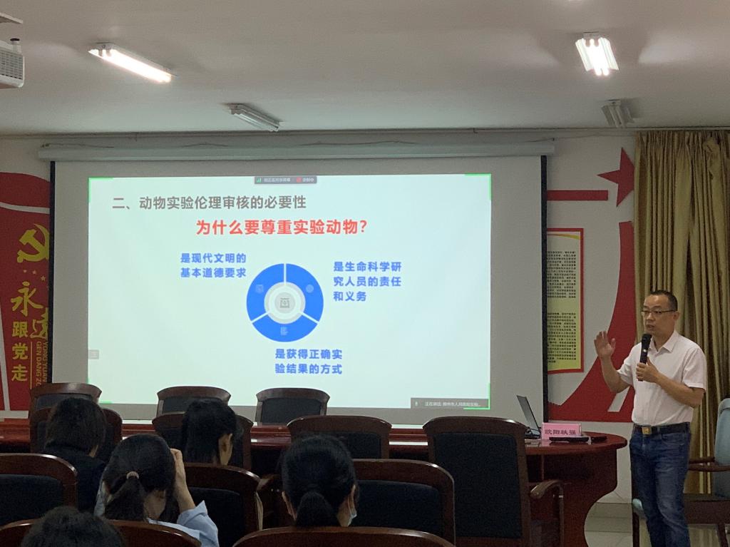 講座中,歐陽軼強博士從實驗動物福利與倫理的由來、動物實驗倫理審核的必要性、動物實驗倫理審核的參考依據、動物實驗倫理審核的主要問題等四個方面,詳細講解了實驗動物福利的基本概念、善待和尊重動物的方式、倫理審查涉及的相關法律法規等內容,并結合自己的審查經驗就倫理審查中常關注的重點問題,以及使用動物時應遵守的倫理原則進行了深入淺出地講解。