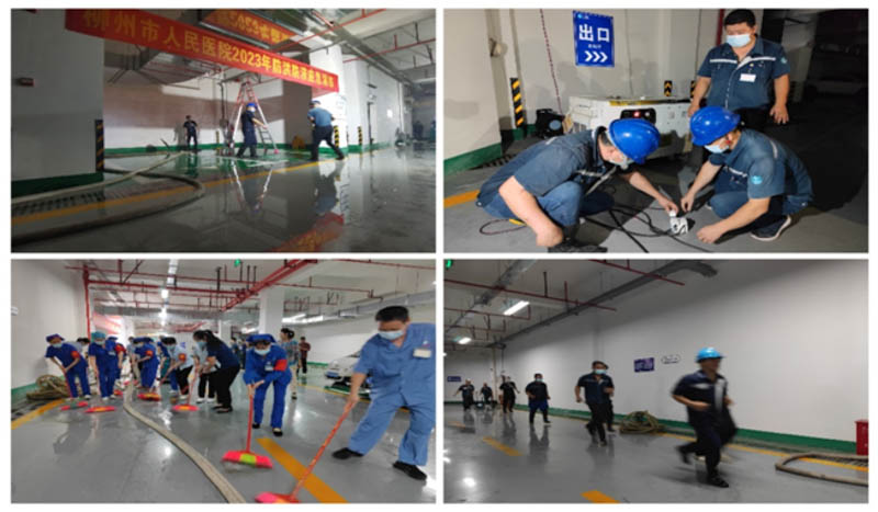 總指揮立即下達搶險指令,啟動柳州市人民醫院防汛救援應急處置預案——一級響應。接到指令后防汛應急搶險小組(防汛搶險分隊、防汛巡查分隊、物資供應及保潔分隊三個工作小隊)和防汛安全保衛工作小組共50余人次火速集結奔赴現場,啟用應急抽水泵2臺、移動發電機1臺,在設立警示標志后,按照各自分工,迅速、高效、有序地進行搶險、巡查。