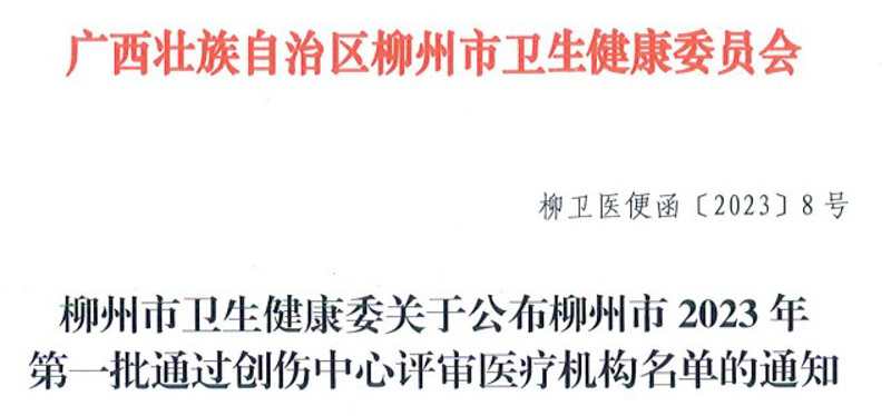 近日,柳州市衛健委公布了2023年第一批通過創傷中心評審的醫療機構名單,柳州市人民醫院醫療集團潭中院區,緊密型醫聯體單位柳城縣人民醫院、鹿寨縣人民醫院通過柳州市II級創傷救治中心評審,柳州市人民醫院醫療集團中西醫結合院區、緊密型醫聯體單位魚峰區雒容鎮中心衛生院通過柳州市基層創傷救治單元評審。