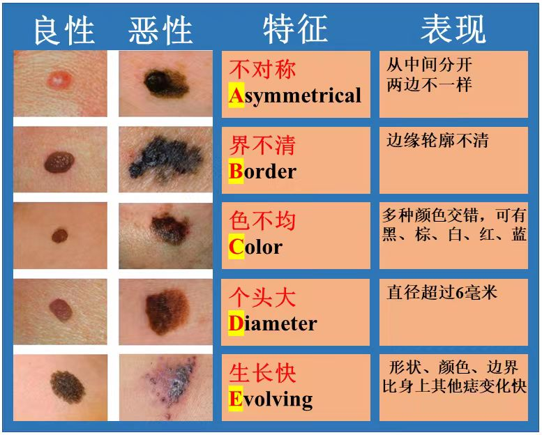 ⑥ 特殊身體階段或激素誘因:例如女性妊娠期可能會導致色素痣的增大,極少數情況下之前存在的色素痣惡變出現ABCDE特征。