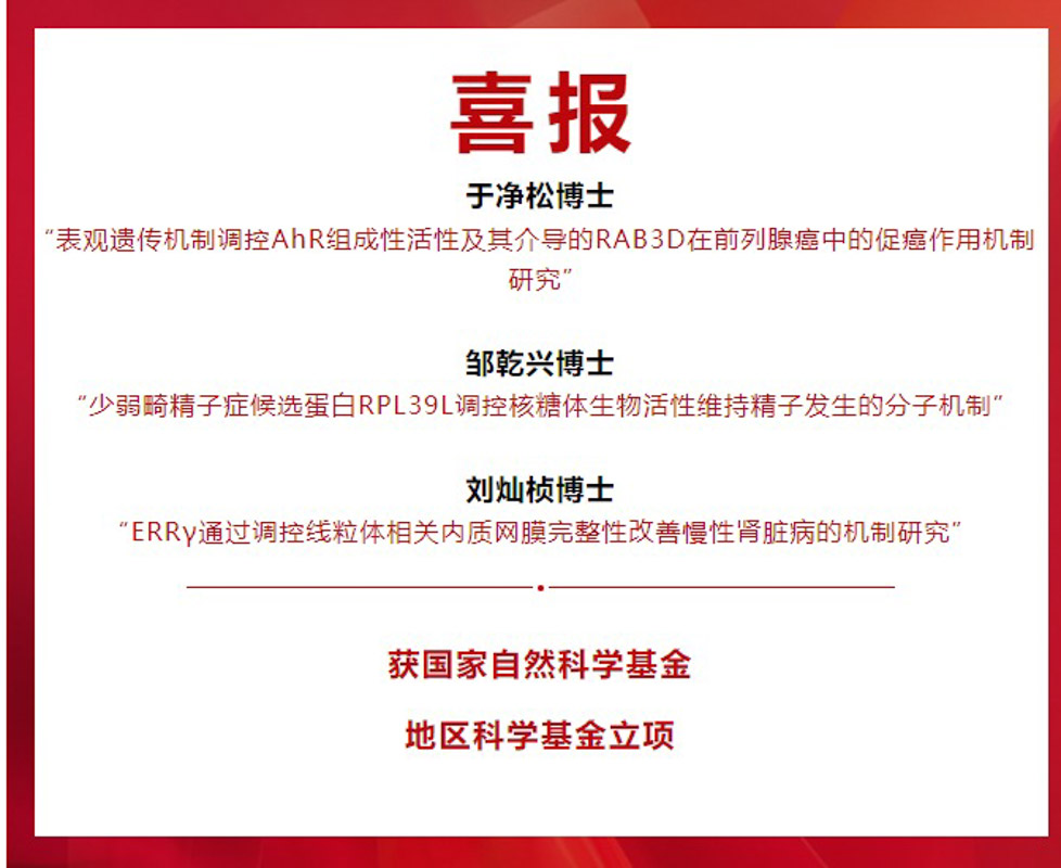 8 月24日,國家自然科學基金委員會公布了2023年國家自然科學基金集中接收申請項目評審結果,柳州市人民醫院泌尿外科于凈松博士、生殖醫學科鄒乾興博士、腎臟病內科劉燦楨博士申報的項目獲國家自然科學基金地區科學基金立項。醫院聚賢引才結碩果,3名博士均為引進的高層次人才。