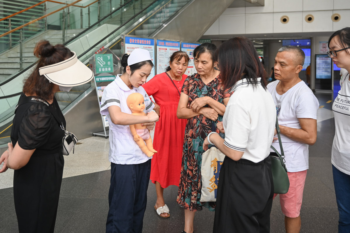 活動現場,急診醫學科醫務人員用通俗易懂的語言給大家講解了救護的概念和日常急救知識,讓人們掌握正確的急救方法,懂得在意外來臨時該如何面對。同時,現場向大家演示了心肺復蘇和海姆立克急救法的操作步驟,手把手幫助群眾掌握急救員知識要點,現場氣氛十分活躍。