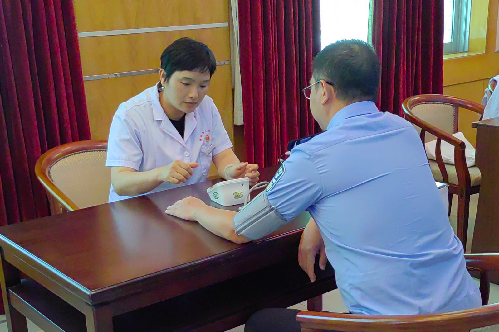 健康管理中心護理人員為民警們提供測血壓、測血糖服務。