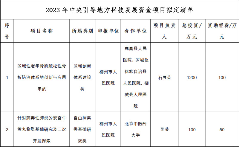 近日,柳州市科技局發(fā)布《關(guān)于下達(dá)2023年柳州市中央引導(dǎo)地方科技發(fā)展資金項(xiàng)目和經(jīng)費(fèi)的通知》,柳州市人民醫(yī)院骨科石展英主任醫(yī)師申報(bào)的《區(qū)域性老年骨質(zhì)疏松性骨折防治體系的創(chuàng)新與應(yīng)用示范》項(xiàng)目及醫(yī)學(xué)科學(xué)實(shí)驗(yàn)中心吳瑩教授申報(bào)的《針對病毒性肺炎的安宮牛黃丸物質(zhì)基礎(chǔ)研究及二次開發(fā)探索》項(xiàng)目獲立項(xiàng)支持,獲資助總額達(dá)150萬元,實(shí)現(xiàn)了醫(yī)院在中央引導(dǎo)地方科技發(fā)展資金項(xiàng)目上零的突破。
