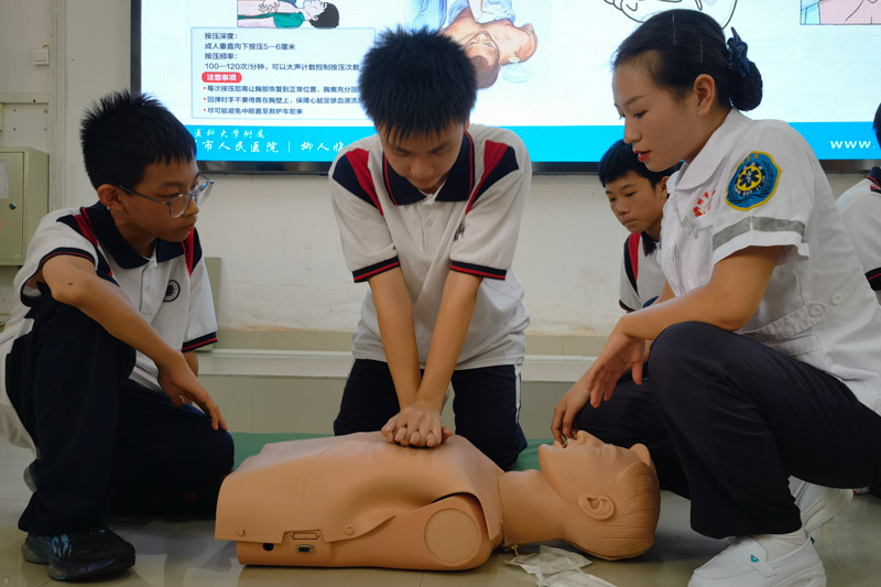 “定位在兩乳頭連線中點(diǎn),雙臂伸直,雙手掌重疊,掌心向下,01,02,03……”在隨后的實(shí)踐操作環(huán)節(jié),醫(yī)護(hù)人員手把手指導(dǎo)同學(xué)們進(jìn)行急救方式練習(xí)并掌握操作要領(lǐng),并對(duì)操作中不到位的地方進(jìn)行指正。