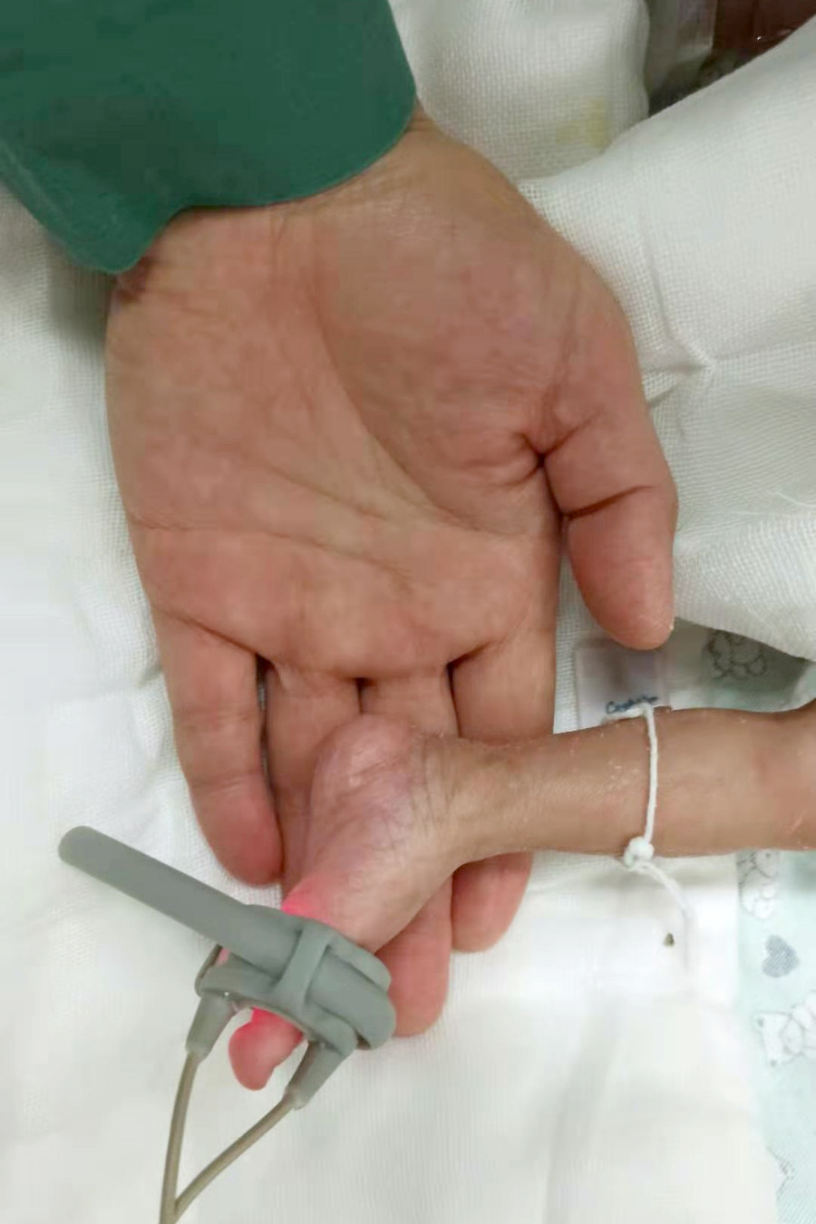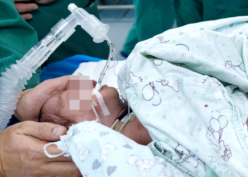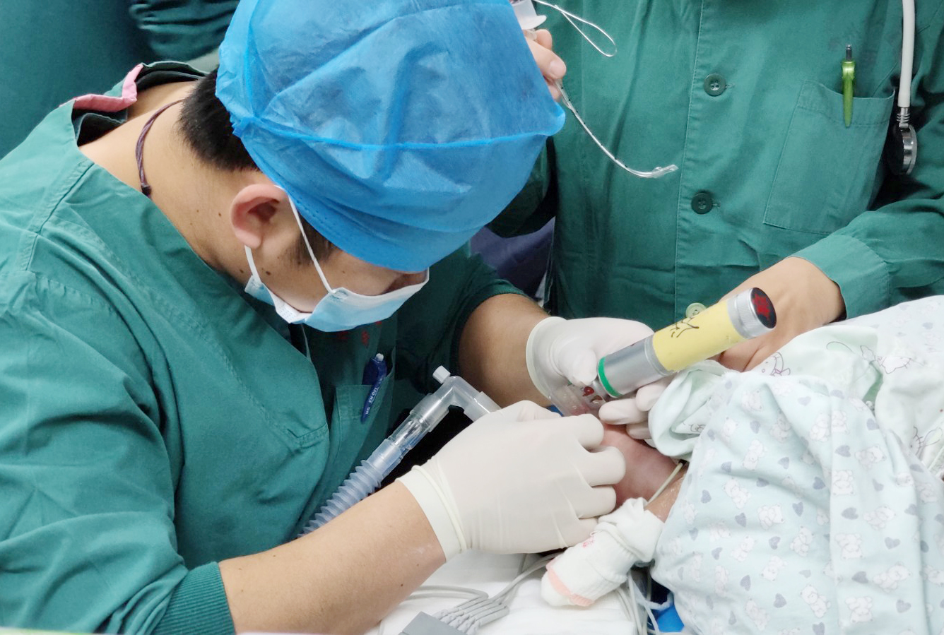 14:30,一個全身粉紅的小嬰兒被捧入手術室。由于只在媽媽肚子里待了33周便提前出生,作為早產兒的他身長只有40cm,體重只有1450克。患兒各個器官都發育得不成熟,出現食道閉鎖+食道氣管漏的情況,還伴有肺炎和反復的呼吸暫停,需要緊急手術。患兒一直昏迷不醒,細長的四肢、微小的身軀,想到要在這樣小的身體里動手術,大家既擔心又心疼!