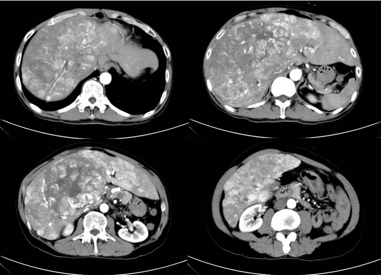 2019年4月26日CT:巨塊型肝癌伴多發子灶融合,門靜脈左右支癌栓形成,正常肝組織僅約10%左右,其余肝臟均被腫瘤侵噬
