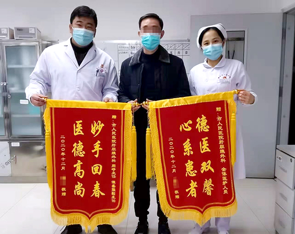 終于在2020年9月的時候,李先生迎來了重生的希望。經肝癌MDT專家組討論,李先生的病情已由不可手術切除狀態成功轉化為可手術切除狀態。9月22日由肝膽胰外科譚盛強副主任醫師、韋敏醫師、黃科團醫師等組成的手術團隊為李先生實施了高難度的肝臟右三葉切除術,徹底切除了肝臟腫瘤病灶。近日,李先生回院復診,經多項相關檢查證實殘余肝臟未發現腫瘤病灶,腫瘤標記物由最初的“爆表”降至完全正常,并且肝功能狀態、體力狀態、營養狀態均保持良好。李先生重獲新生,他帶著家人,將承載著真誠感激之情的錦旗送到了肝膽胰外科醫護人員的手里,表達對全體醫務人員的衷心感謝。