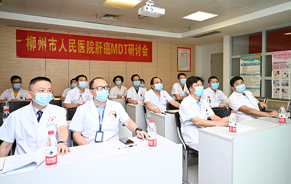 “只要有一絲希望,我們都會盡100%的努力。”李先生的家人向醫生們表達了強烈的求生欲望。肝膽胰外科譚盛強副主任醫師是李先生的主診醫師,同時也是柳州市人民醫院肝癌MDT專家組秘書,他立即組織了肝膽胰外科、放射科、超聲科、腫瘤科、肝病科、消化內科、病理科、藥學部、營養科等專業科室進行多學科聯合診療(MDT)討論。
