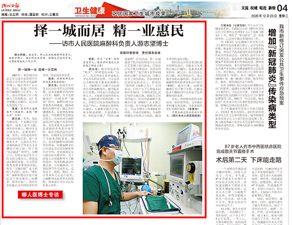 2007年,來自湖北的游志堅從華中科技大學同濟醫學院麻醉學博士畢業,隨后南下廣東從醫,曾在廣東省三甲醫院擔任麻醉科主任多年。今年,游志堅放棄了在一線城市工作的機會,從廣東舉家搬遷至柳州,進入市人民醫院工作。