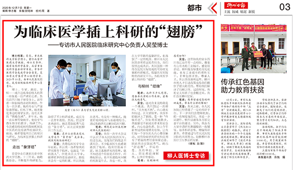 吳瑩:我來之前,市人民醫院已經搭建了一定的科研平臺。下一步我們會理順機制,把一些制度規范化,再進一步從硬件、軟件設施等各方面完善平臺的建設。另外我們希望塑造整個醫院良好的科研氛圍,在院內陸續展開一系列科研講座。另外,我會以我的經驗跟大家分享一些科研思維,為大家申請研究課題提供一些輔導,培養科研思維,提升科研素養。同時我們也會注重教學和學生的培養,把教學、臨床與科研聯系得更緊密,希望通過與市人民醫院團隊的共同努力,助推柳州市醫療衛生事業的發展。
