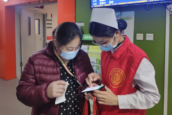 ▲指導(dǎo)患者使用智能手機(jī)操作就診流程的志愿者