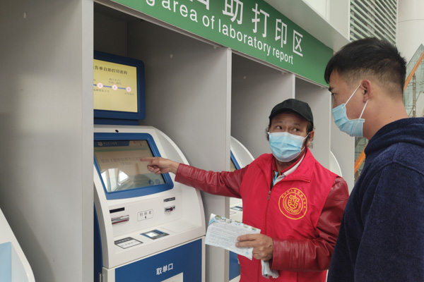 ▲志愿者岳黎克(后)引導(dǎo)患者打印紙質(zhì)檢查報(bào)告