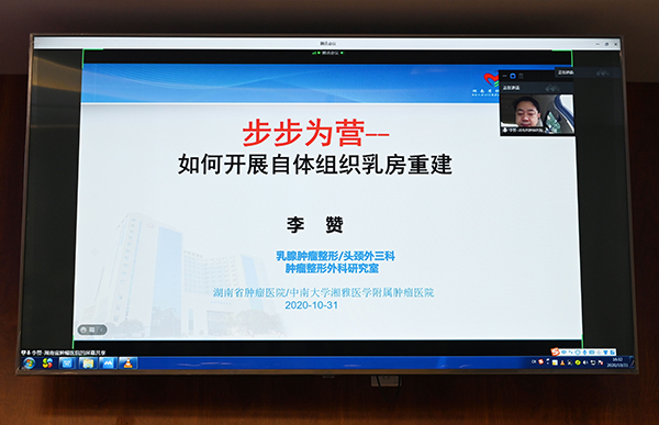 在柳州市工人醫院歸奕飛教授的主持下,大會邀請到湖南省腫瘤醫院李贊教授以《步步為營——如何開展游離皮瓣乳房再造》為題進行線上會議的講課。同時還有來自重慶醫科大學附屬第一醫院的孔令泉教授、廣西醫科大學第一附屬醫院曾健教授、廣西醫科大附屬腫瘤醫院楊華偉教授、李秋云教授分別以《關注乳腺癌伴隨疾病的管理》《乳腺癌乳房重建術后生活質量評價》《乳腺癌術后自體重建》《以治愈為目標的HER2陽性早期乳腺癌系統治療策略》為題進行精彩授課。