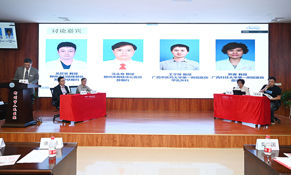 廣西科技大學第一附屬醫院熊春教授、柳鐵中心醫院沈永奇教授、柳州市婦幼保健院龍晨蒙教授、廣西中醫藥大學第一附屬醫院王宇坤教授,四位學者圍繞三位講者的內容展開了熱烈討論,對乳腺癌手術、輔助治療等進行了學術交流,大會主席莫欽國教授被頻頻提問,并做解答,現場氣氛熱烈。