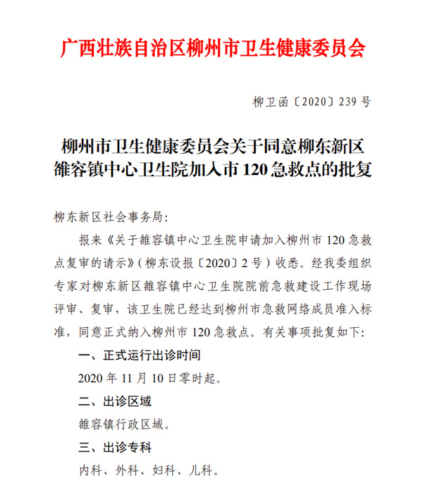 11月10日,雒容鎮中心衛生院120急救點通過評審,正式加入柳州市120急救點。該站點的落成,不僅體現了醫聯體協同發展、強基層的政策理念,使雒容鎮中心衛生院的醫療救治水平再上新臺階;同時也標志著急救資源的進一步優化配置,縮短了轄區內的急診急救半徑,可以為周邊群眾提供更加高效、快捷、優質的醫療服務。
