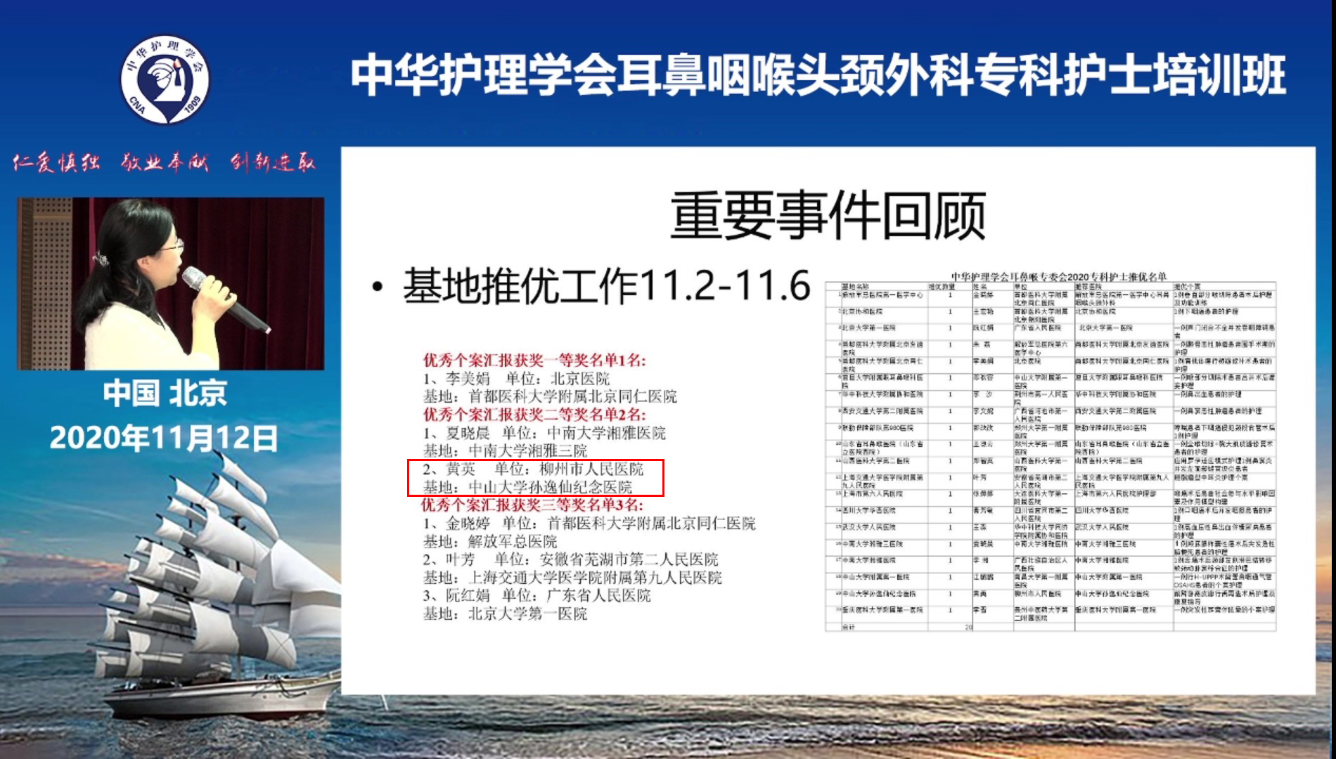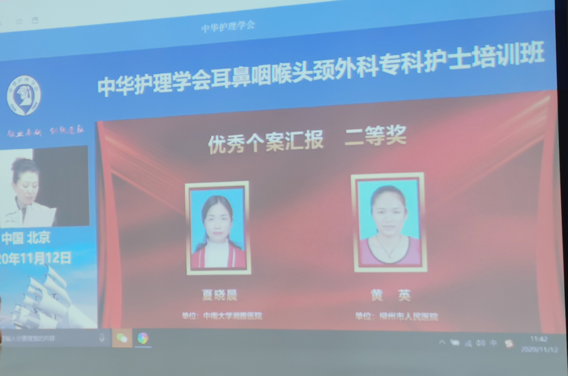 11月12日,中華護(hù)理學(xué)會(huì)耳鼻喉科護(hù)理專(zhuān)業(yè)委員會(huì)在線舉辦 “2020年耳鼻咽喉頭頸外科專(zhuān)科護(hù)士培訓(xùn)班畢業(yè)典禮”,在全國(guó)42個(gè)專(zhuān)業(yè)基地共234名學(xué)員中,評(píng)出優(yōu)秀個(gè)案匯報(bào)一等獎(jiǎng)1名、二等獎(jiǎng)2名、三等獎(jiǎng)3名,我院耳鼻咽喉科主管護(hù)師黃英的個(gè)案匯報(bào)《一例前臂游離皮瓣行舌再造術(shù)后護(hù)理及康復(fù)指導(dǎo)》得到專(zhuān)家評(píng)委和學(xué)員的肯定,在眾多學(xué)員中脫穎而出,獲得優(yōu)秀個(gè)案匯報(bào)二等獎(jiǎng)。