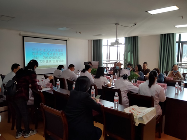 河東街道社區(qū)衛(wèi)生服務中心副主任周憲鳳首先向人大代表一行匯報了中心在開展新型冠狀病毒肺炎疫情防控采取各項措施和開展愛國衛(wèi)生、居民健康教育與促進的情況。
