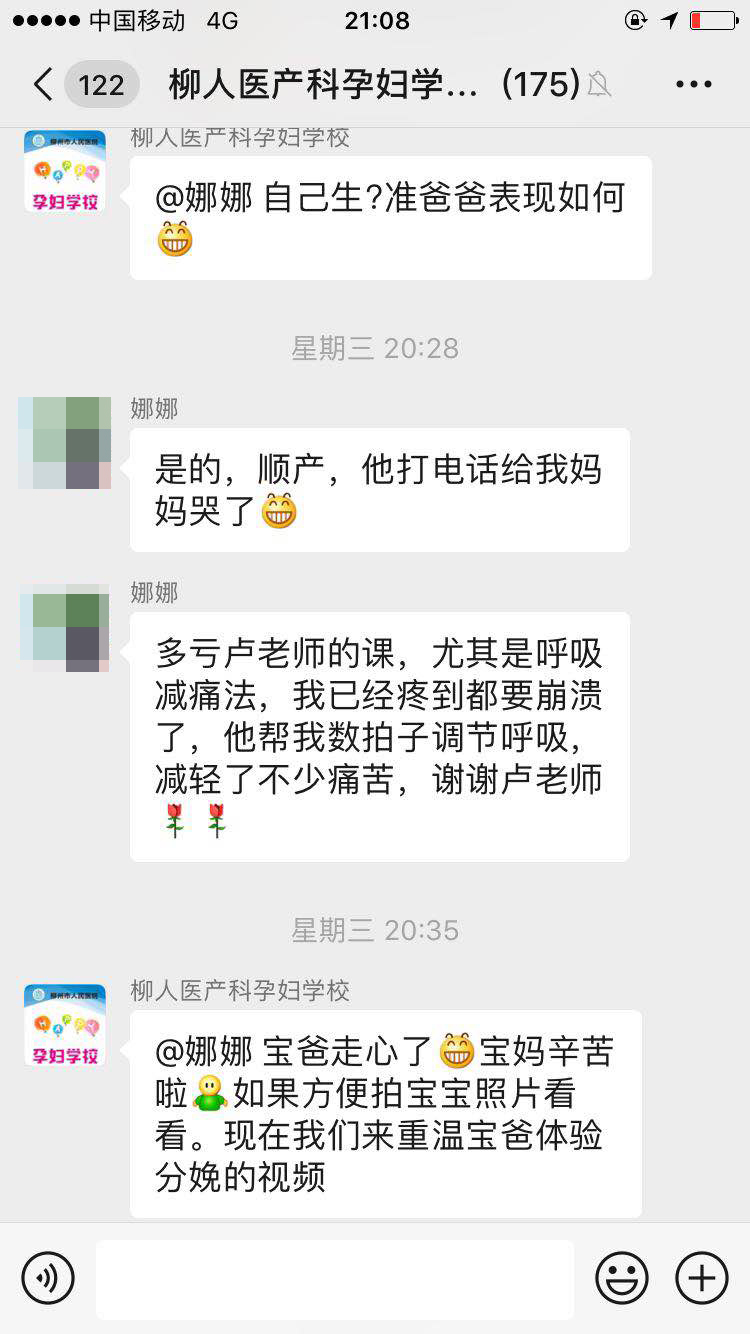 在課程結束后,孕媽媽們還通過孕婦學校微信群與老師反饋和交流,近期順利分娩的幾位孕媽紛紛表示參加快樂分娩沙龍和呼吸減痛分娩法等的學習后收獲很大,臨產住院是有備而來,不再是半夜手忙腳亂跑醫院。一位叫娜娜的孕媽媽反饋說呼吸減痛法幫助其減輕了不少痛苦,寶爸在旁邊幫數節拍調節呼吸,是走心又有存在感的陪產了。
