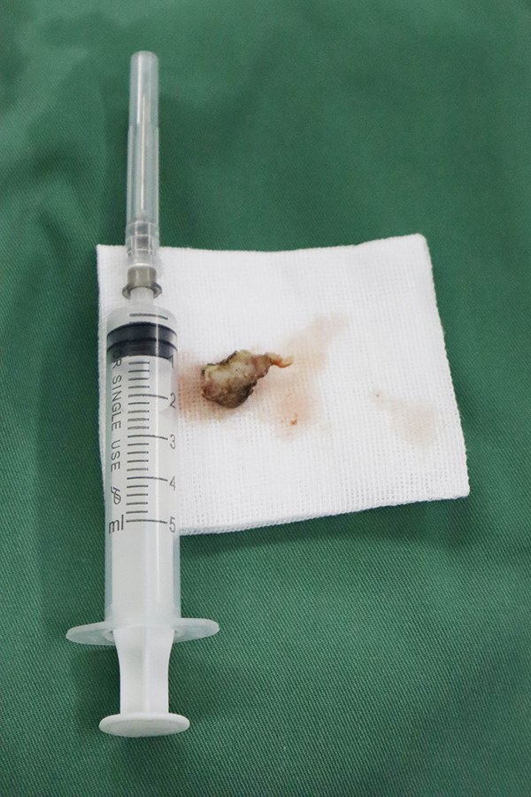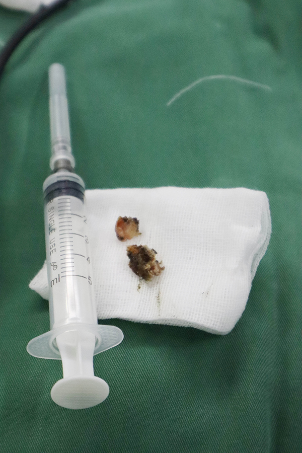 呼吸內鏡介入團隊經(jīng)氣管鏡下分次予激光燒灼氣管下段、右主支氣管腫物,腫物部分消融、右主支氣管部分通暢后,分次圈套器圈套電凝、電切部分腫物,予活檢鉗、網(wǎng)籃分次取出切除的腫物,經(jīng)過三個小時的操作終于打開右肺通道,迅速改善患者氧合功能。隨著患者生命通道打通,手術室所有的醫(yī)護人員都松了一口氣。