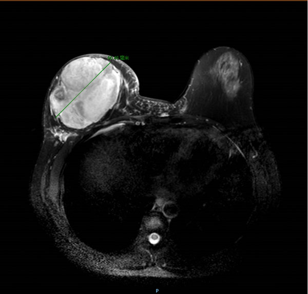 經過完善而系統的檢查,結合病史、查體及輔助檢查,主診醫生覃舒婷副主任醫師考慮譚女士右乳腫瘤為乳腺葉狀腫瘤復發,建議行手術治療。可在這時,原本有著堅定手術意愿的她卻動搖了,因為醫生的建議是右乳乳腺的全部切除!“為什么我的乳房要全部切掉!”不解的譚女士及家屬來到醫生辦公室詢問,覃醫生耐心地為患者解答了疑惑,結合磁共振影像,譚女士明白了,磁共振圖像上,右乳內近10cm的巨大腫瘤,已經將正常腺體組織壓迫到所剩無幾,殘余的腺體不僅不能支撐一個正常的乳房,還可能再次復發。