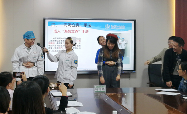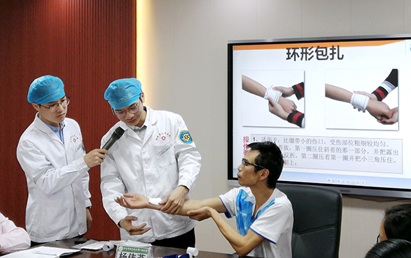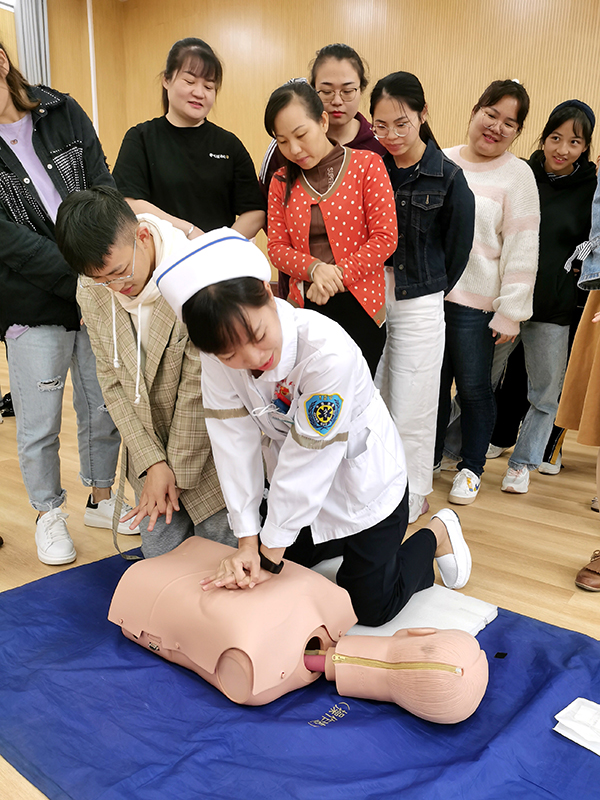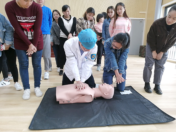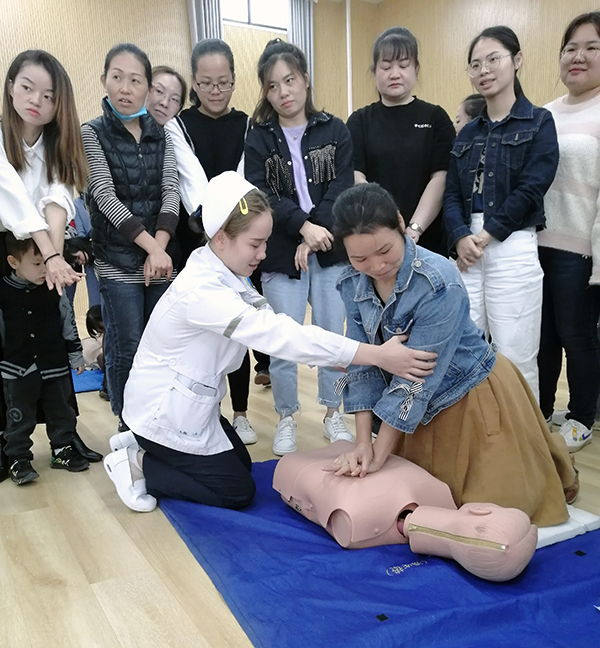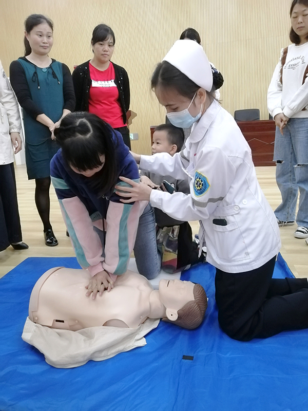 接下來,由其余幾位醫(yī)護(hù)人員針對(duì)當(dāng)幼兒園內(nèi)出現(xiàn)意外傷害事件時(shí),應(yīng)如何施救進(jìn)行了現(xiàn)場(chǎng)教學(xué)演練,教學(xué)內(nèi)容豐富,貼近生活,其中包括:兒童溺水的防治、幼兒意外傷害的緊急救護(hù)(止血包扎急救技術(shù))、心肺復(fù)蘇術(shù)、海姆立克急救法等專題。醫(yī)護(hù)人員們采取理論講解+現(xiàn)場(chǎng)實(shí)操的方式進(jìn)行教學(xué),老師們親身體驗(yàn)?zāi)M操作,醫(yī)護(hù)人員“一對(duì)一”地進(jìn)行各項(xiàng)操作要領(lǐng)指導(dǎo),糾正了老師在急救時(shí)一些不恰當(dāng)?shù)淖龇?,模擬演示了遇到緊急情況(如心跳呼吸驟停、氣道異物梗阻等)時(shí)的規(guī)范處理步驟和方法,老師們積極參與,現(xiàn)場(chǎng)學(xué)習(xí)熱情高漲,培訓(xùn)收到良好效果。