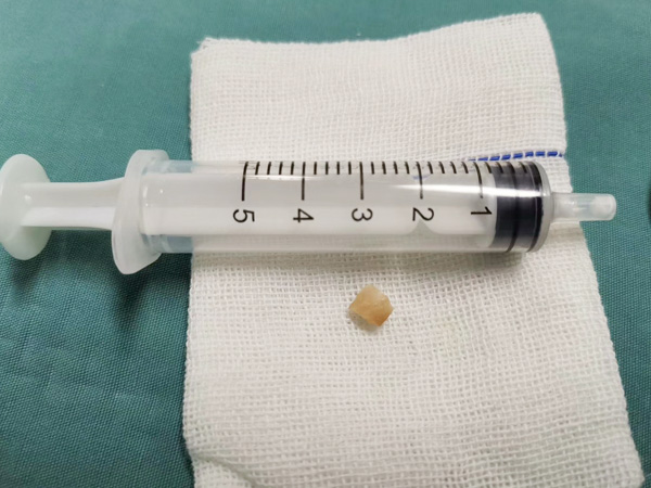 情況緊急,他當機立斷,直接雙膝跪在地上為患兒進行了手術,不到2分鐘時間,患兒氣管內的異物被成功取出,小朋友的氣緊立即緩解。他發現異物并不是橘子,而是一粒直徑僅有3mm已經灰暗變軟的花生仁,通過詢問家長才知道,7天前小朋友吃過花生。
