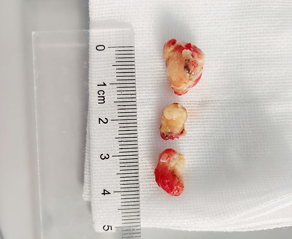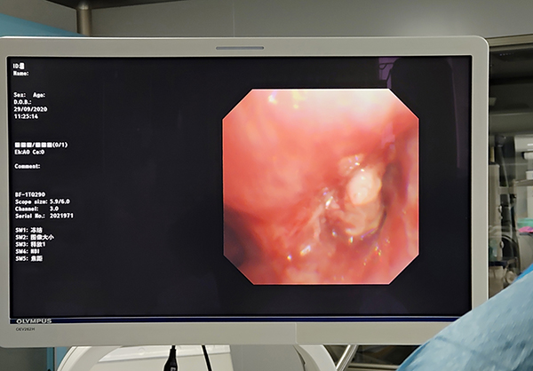 盡管經過充分的術前準備,術中在氣管鏡下看到的情況遠比術前預想的復雜,這對醫生的操作提出了更高的要求。介入團隊成員緊密配合,有條不紊地小心操作,采用圈套器圈套,高頻電刀電切、電凝分次切除腫物,通過冷凍凍取、異物鉗鉗出切除腫物將氣道內腫物摘除,再通過凍融減少肉芽組織增生,術中患者曾一度出現劇烈咳嗽等呼吸道反應及氧飽和度下降等緊急情況,但經過積極處理,都成功化險為夷,順利完成手術,術中出血量少。