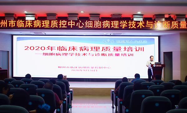 為進一步規范病理實驗室操作,加強細胞病理學實驗室質量控制管理,提高我市醫療機構細胞病理學技術與診斷質量,保障醫療質量與安全,2020年9月26日,由掛靠我院的柳州市臨床病理質量控制中心在我院第一學術廳成功舉辦《細胞病理學技術與診斷質量培訓班》。培訓班邀請了著名的細胞病理學專家、廣東省病理診斷工程技術研究中心細胞病理室主任彭振武教授,廣西臨床病理質控中心主任、桂林醫學院附屬醫院病理科主任曾思恩教授,廣西醫學會病理學分會主任委員、廣西醫科大學第一附屬醫院病理科主任馮振博教授,廣西臨床病理質控中心秘書長、桂林醫學院附屬醫院病理科副主任鄭錦花教授,桂林醫學院附屬醫院病理科林靜教授、廣西醫科大學第一附屬醫院病理科馬薇教授等專家進行現場培訓。