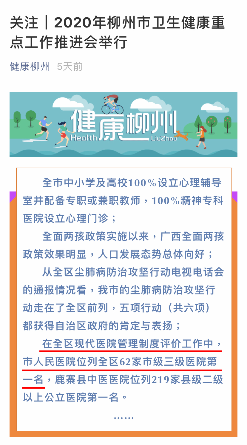日前,柳州市衛生健康委《健康柳州》官宣:在全區現代醫院管理制度評價工作中,柳州市人民醫院位列全區62家市級三級醫院第一名。這是柳人醫人腳踏實地,奮勇拼搏,不斷提升患者獲得感和幸福感的真實寫照,更是醫院為保障全區百姓健康不懈努力的目標!