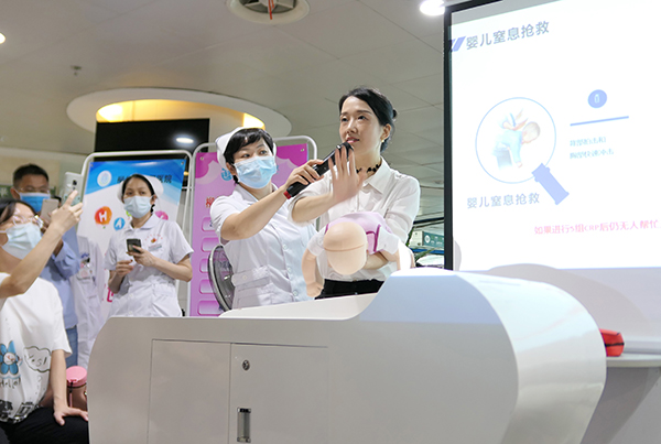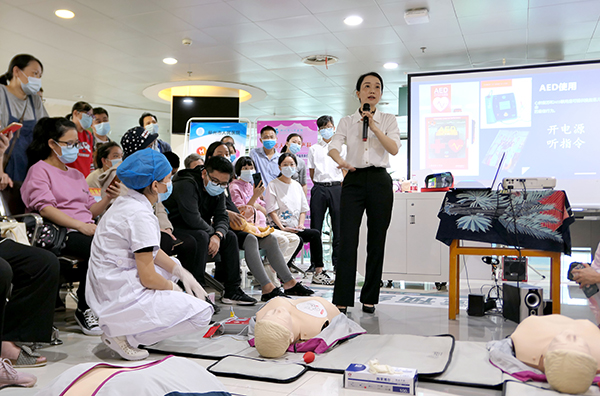 10月5日上午,營養科易慶坤醫師給大家分享了“產褥期飲食原則”,以最簡單的形式分享最科學的產后飲食方法。產科副主任醫師葉云飛教大家“嬰兒急救知識及AED的使用”,現場有多位美國心臟協會AHA認證的Heartsaver First Aid CPR AED 證書的老師進行現場演示和指導學員們練習。學員們有記筆記的、有拍視頻的、有踴躍參與訓練的,在旁邊觀看的學員也擺動著自己的手進行模仿練習,外圍還有寶媽抱著寶寶在默默地聽課。今日課程反響熱烈,報名130人,簽到130人,課后大家還跟孕婦學校的盧連梅老師反饋期望多安排這樣的課程。