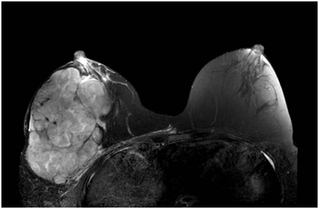 據了解,劉女士是在一年前開始發現右側乳房有一個黃豆大小的腫物,當時未予引起重視,直到幾個月前,感覺瘤子一下子變大了,并且一天比一天大,才匆匆忙忙來醫院檢查。劉女士穿著寬松的上衣,右手托著右胸,緩緩走進病房,邊走邊喘著氣。掀開上衣,眼前的一幕驚呆了查體的管床醫生,整個右乳被腫瘤占據,測量約有20cm,皮膚發紅,足足比左側乳房大了一倍。眼前的這個巨大的腫瘤,不僅僅影響到劉女士的工作生活,最重要的是,還不明確性質。