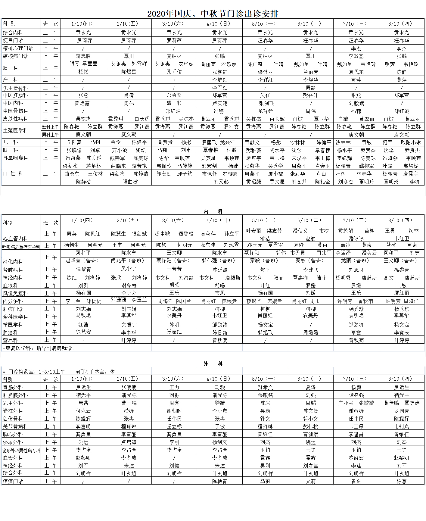 2020年“國慶、中秋節”放假期間,我院門診、急診工作安排如下: