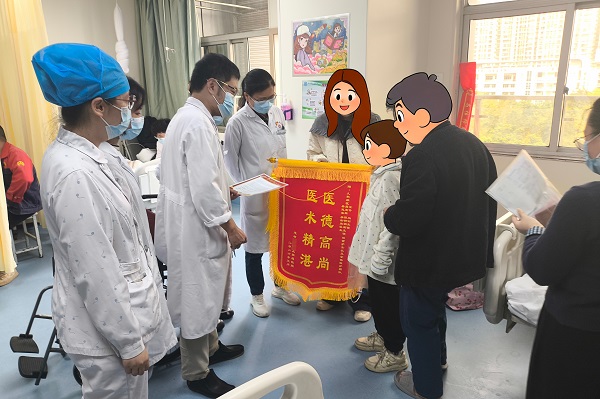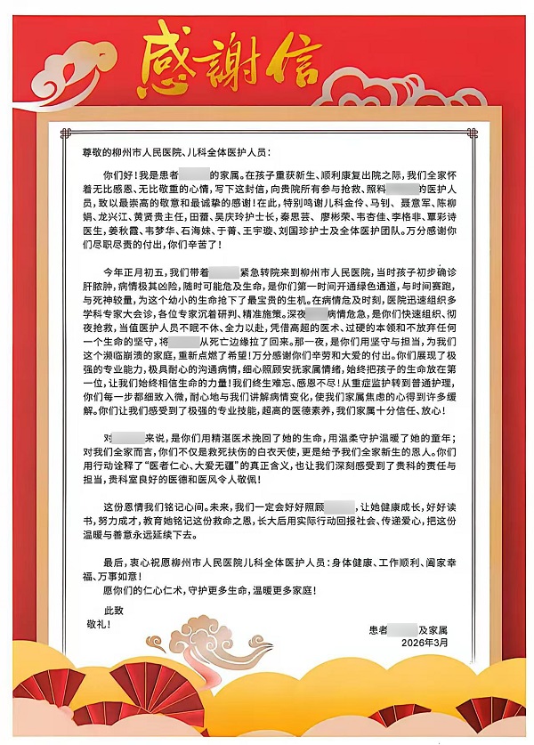 3月14日小靈順利康復出院。出院時,曾經(jīng)密密麻麻列在診斷書上的21條:膿毒性休克、急性呼吸窘迫綜合征(重度)、多器官功能障礙、彌漫性腹膜炎……每一條都足以致命的病癥,在小靈頑強的生命力和醫(yī)護人員的守護下,全部扛了過來。出院之際,小靈父母送上了早已準備好的感謝信和錦旗,紙頁載千言,道不盡小靈一家的感謝。在揮手和送別中,大家心里都是對小靈健康成長的美好祝愿。