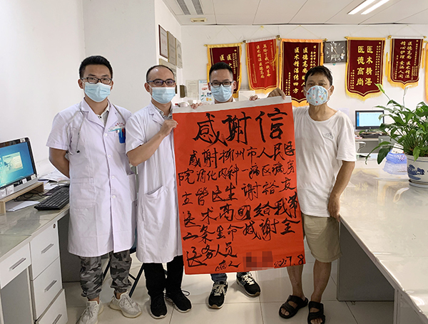李大爺出院當天,熱淚盈眶地拿著一封感謝信來到柳州市人民醫院消化內科一病區醫生辦公室,激動地說:“謝謝你——謝裕友醫生,謝謝消化內科一病區全體醫務人員!在這里,我感受到了高素質、專業化的隊伍所帶來的滿滿正能量,感受到了縷縷溫暖。是你們給了我第二次生命,你們以全心全意的努力和付出,以高尚的醫德、精湛的醫術,以不辭勞苦、任勞任怨的優秀品質,體現了柳州市人民醫院精神文明建設的成果,展示了共產黨員永葆先進性的風貌,更有力地詮釋了貴醫院‘一切以病人為中心’的高尚醫德!”