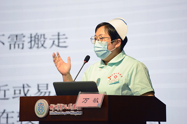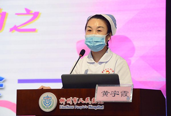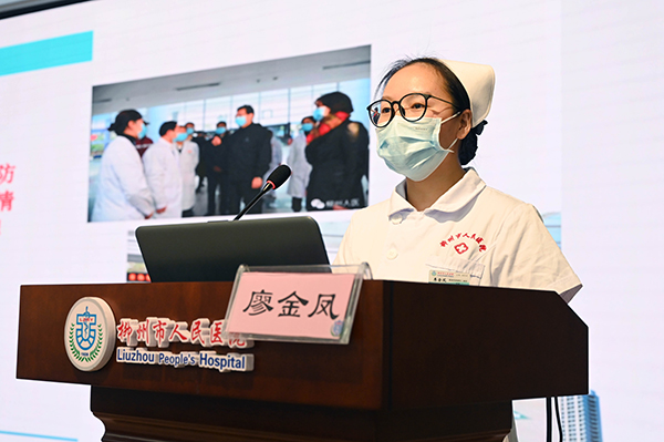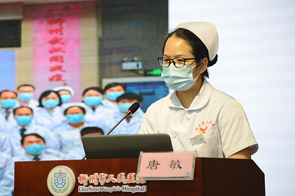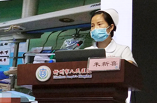 呼吸與危重癥醫學科二病區副護士長朱新喜以“逆行出征,綻放青春風采”為題,從護理管理、人員安排、院感防控、加強個人防護,制度建設,人才培養、梯隊建設等方面,全面分享了她在武漢協和醫院西院重癥監護室工作的寶貴經驗。她說:“這段援鄂經歷是她一生的財富。大地復蘇,疫情終將過去,華夏兒女萬眾一心,同心同德,以勇毅之花,定能將險惡之疫驅之殆盡,令中華安康,讓柳州安康。”