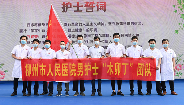 柳州市人民醫(yī)院十分重視護(hù)理隊(duì)伍建設(shè),吸引男護(hù)士加入護(hù)理團(tuán)隊(duì),凝聚男護(hù)士的集體力量,建立了一支健康、高效的護(hù)理團(tuán)隊(duì),2020年5月,柳州市人民醫(yī)院男護(hù)士——“木卯丁”團(tuán)隊(duì)成立了!“木卯丁”團(tuán)隊(duì),意義非凡:木卯丁,形似“柳丁”,寓意柳州的南丁格爾。木:生命綠色;卯:卯時(shí)早上5-7點(diǎn),破曉,黎明的時(shí)辰,代表希望,也是工作的時(shí)間;丁:“丁”與南丁格爾中的“丁”一樣,“丁”同音“釘”,契合柳州工業(yè)精神?!澳久 庇?5名男護(hù)士,團(tuán)隊(duì)成立后,將在護(hù)理職業(yè)生涯發(fā)展、護(hù)理專科建設(shè)、社會(huì)公益活動(dòng)以及應(yīng)急響應(yīng)等方面開(kāi)展有關(guān)工作,打造柳州市人民醫(yī)院的“男護(hù)士”品牌。