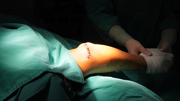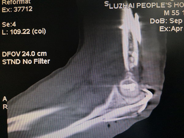 在經(jīng)過縝密的術(shù)前討論后,4月21日,由柳州市人民醫(yī)院派駐我院的醫(yī)聯(lián)體專家——骨科主任王棟棟主刀,醫(yī)院骨科一病區(qū)副主任陳鴻潔協(xié)助,共同為患者實施該手術(shù)。術(shù)中,王主任成功將患者的部分髂骨取出,結(jié)合患者殘留的骨質(zhì)及部分關(guān)節(jié)軟骨,重建肱骨遠端的滑車關(guān)節(jié)、球窩關(guān)節(jié)及骨性結(jié)構(gòu),恢復肱骨遠端的正常解剖角度。由于手術(shù)過程十分復雜,整臺手術(shù)耗時近5個小時才順利完成。